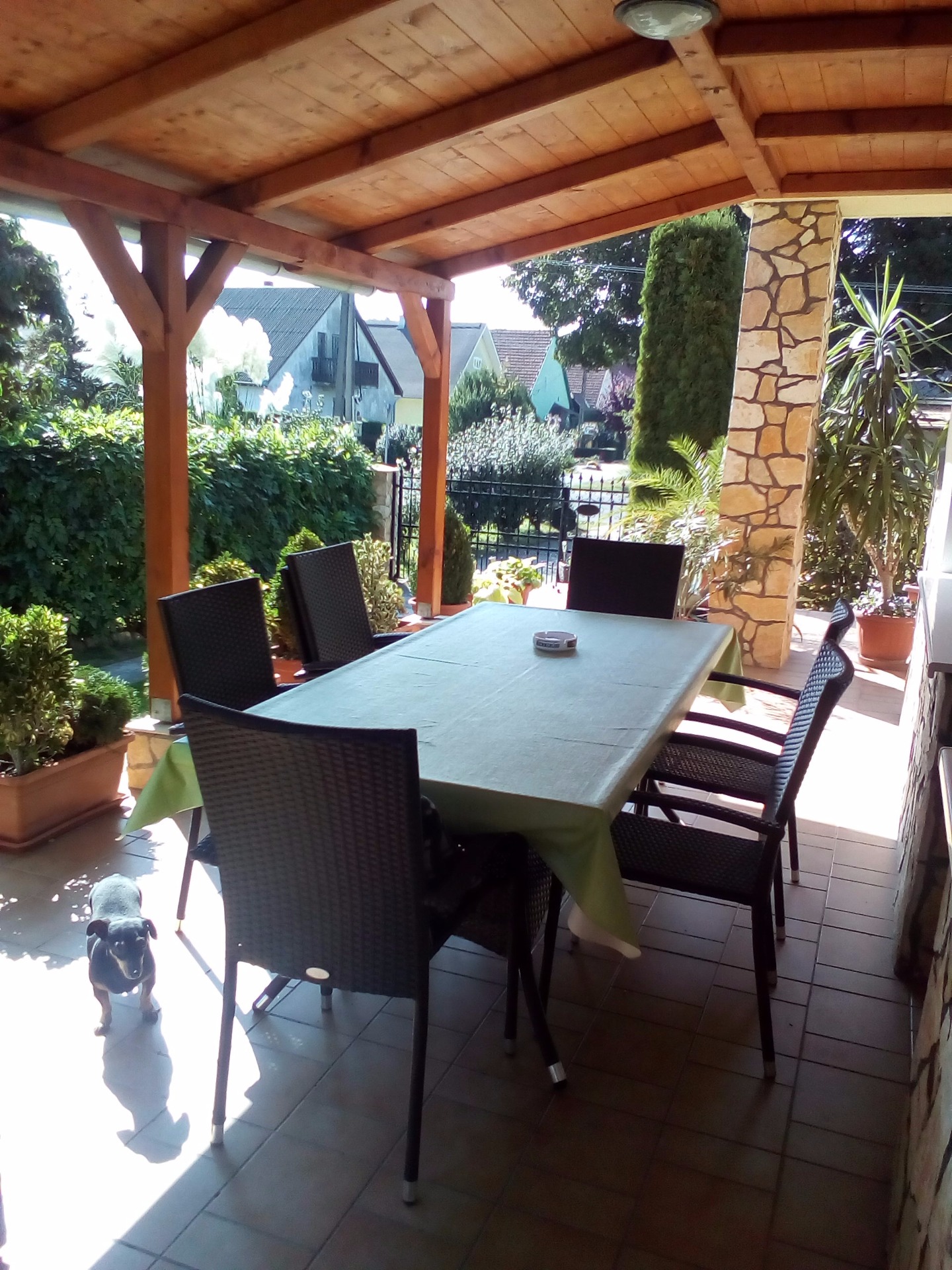 Vendégházunk földszinti apartmanja 5 személyes, két hálószobás . Az egyik szoba 3 ágyas( televízióval) a másik szoba pedig 2 ágyas. Tartozik hozzá még egy nagy , teljesen felszerelt konyha, egy fürdőszoba ,káddal. Egy wc. És egy nagy fedett terasz, teraszbútorral.